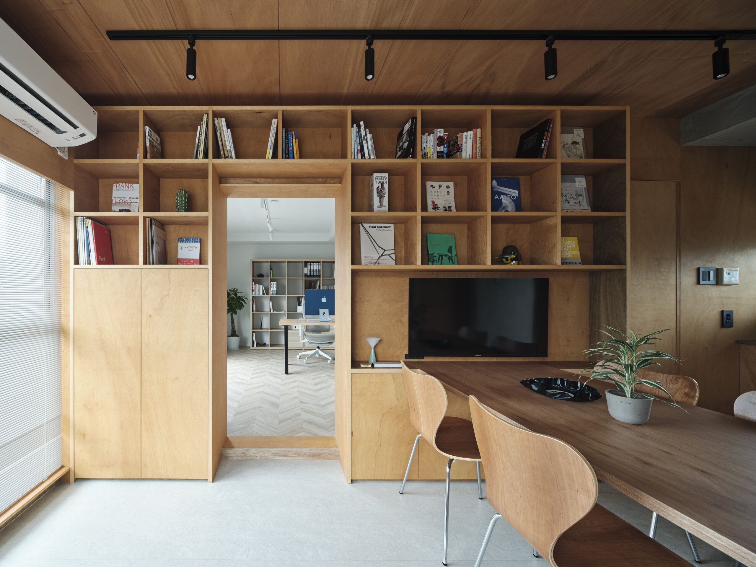 No door is installed between the lounge and the workspace. Instead, the width and depth of the opening are carefully adjusted through custom furniture, allowing visual control while maintaining spatial continuity.
