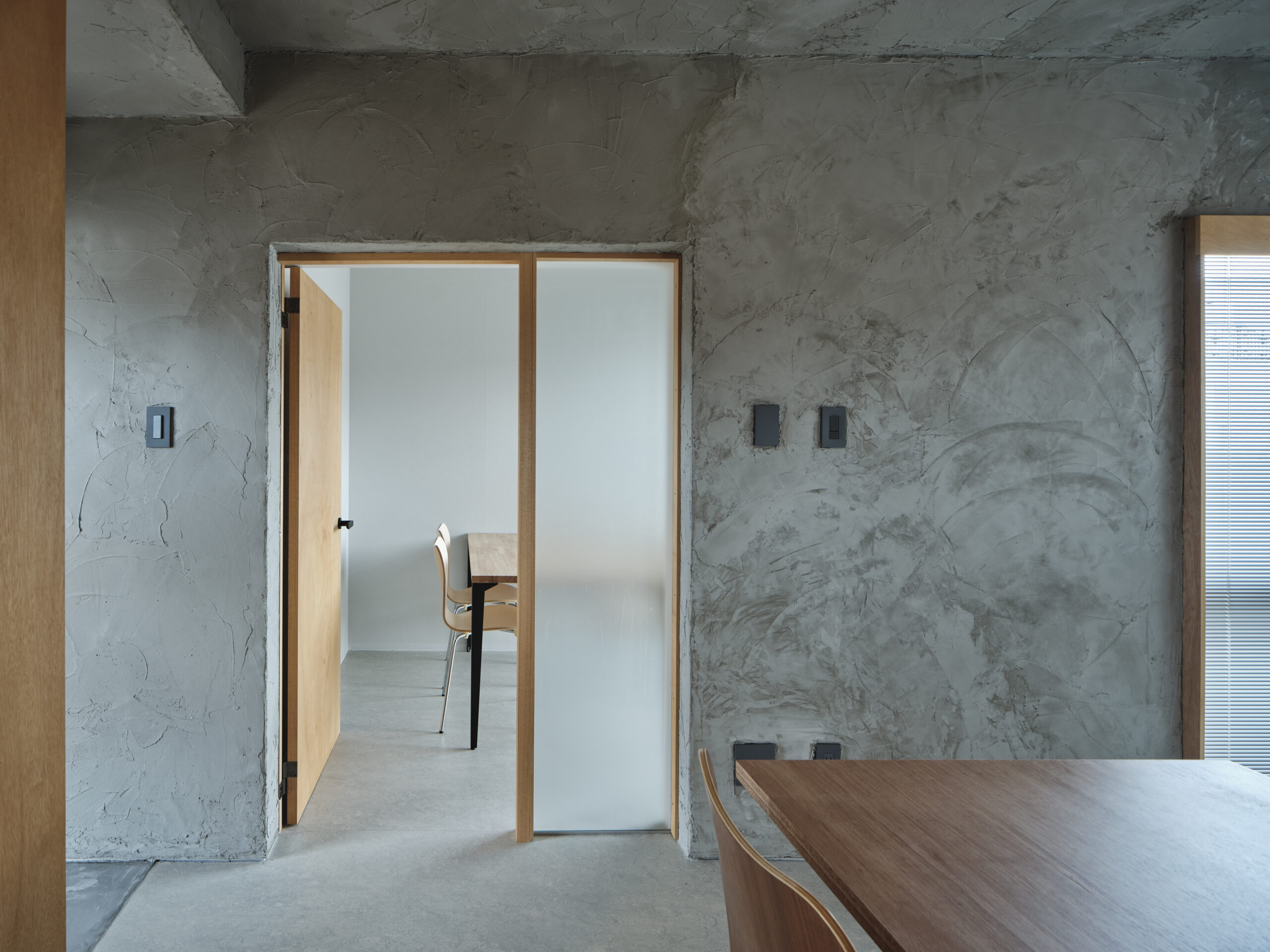 ラウンジとミーティングルームを隔てる建具には半透明ガラスを用い、人の動きや光の移ろいが映り込むことで、空間の奥行きや隣接する気配が感じられる計画としている。ガラス下枠を高さ10mmのアルミ枠とすることで、粗目のテクスチャーを持つ壁面に対して足元を軽やかに見せている。