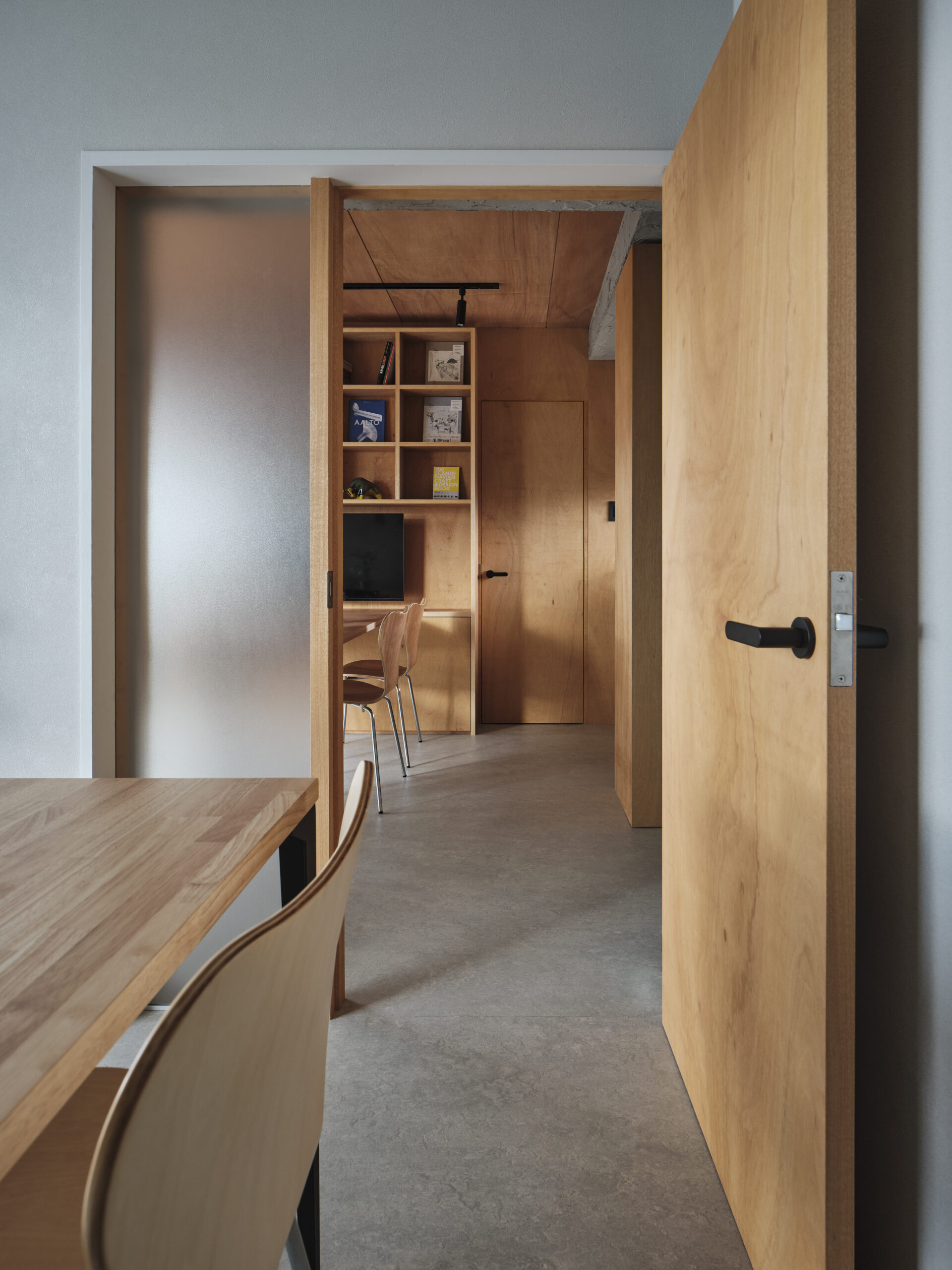 Within a limited floor area and a highly subdivided structure, the project carefully orchestrates boundaries, materials, and custom furniture to accommodate acts of crossing, giving the small spaces a sense of continuity and spatial density.