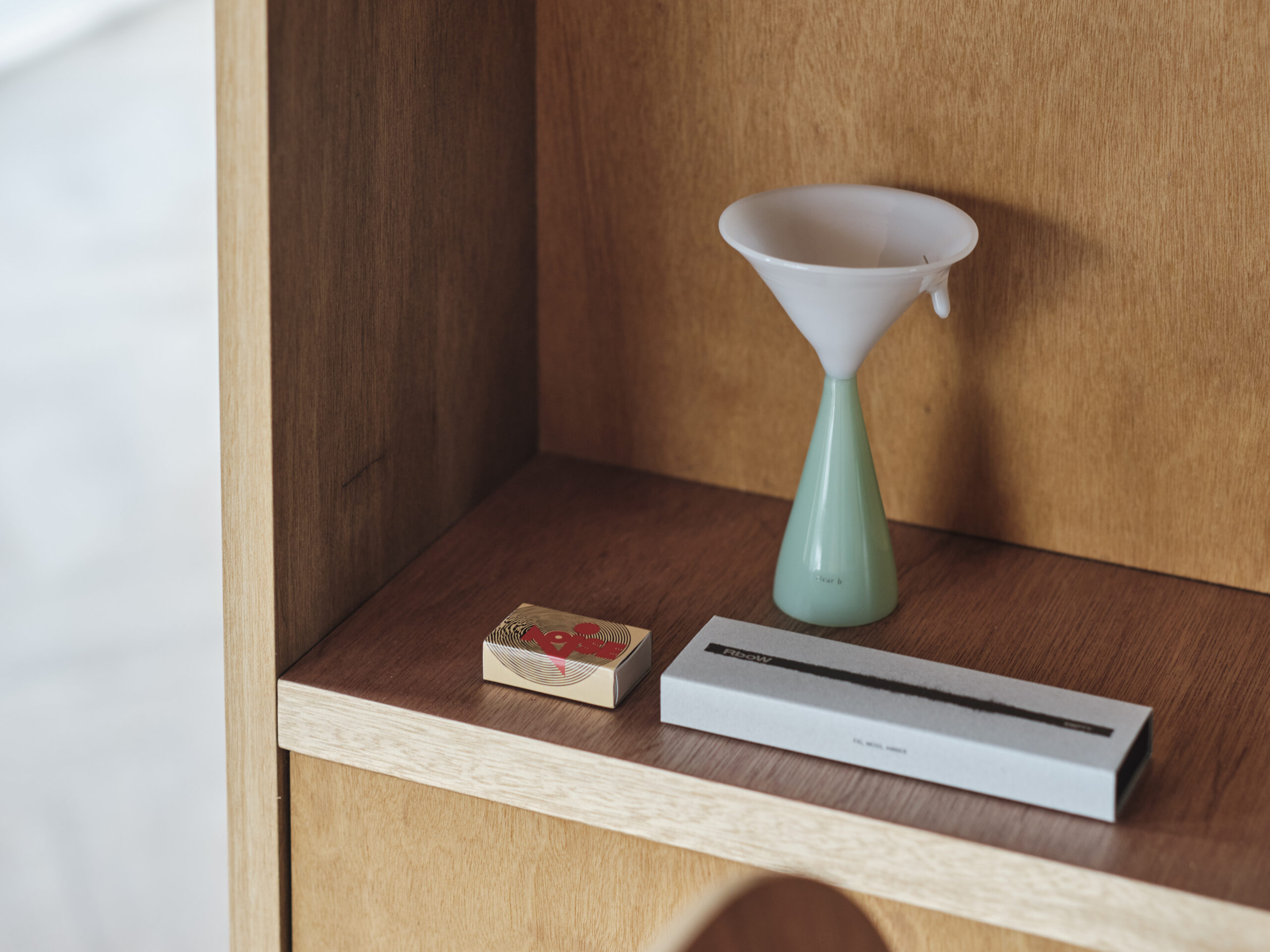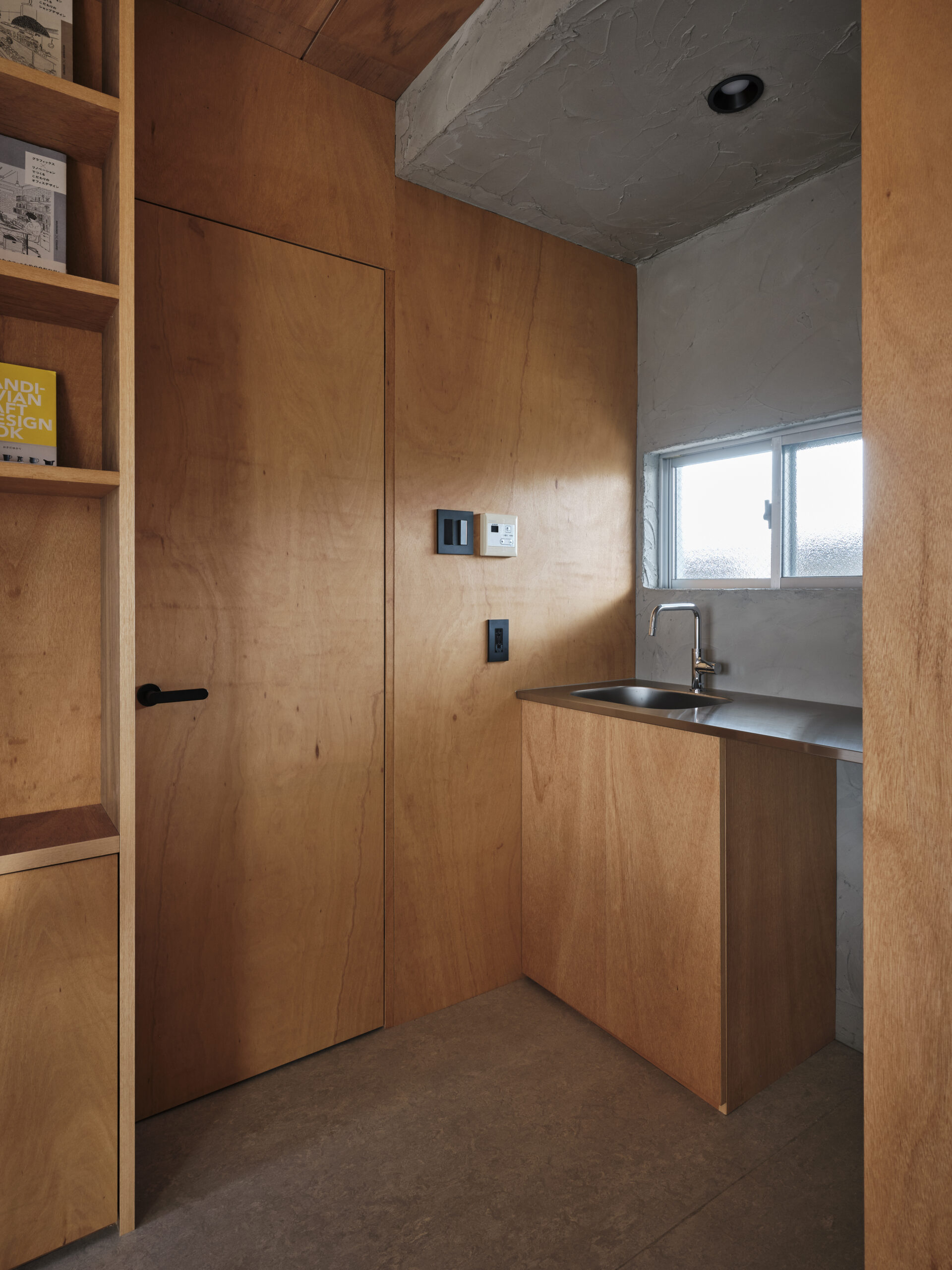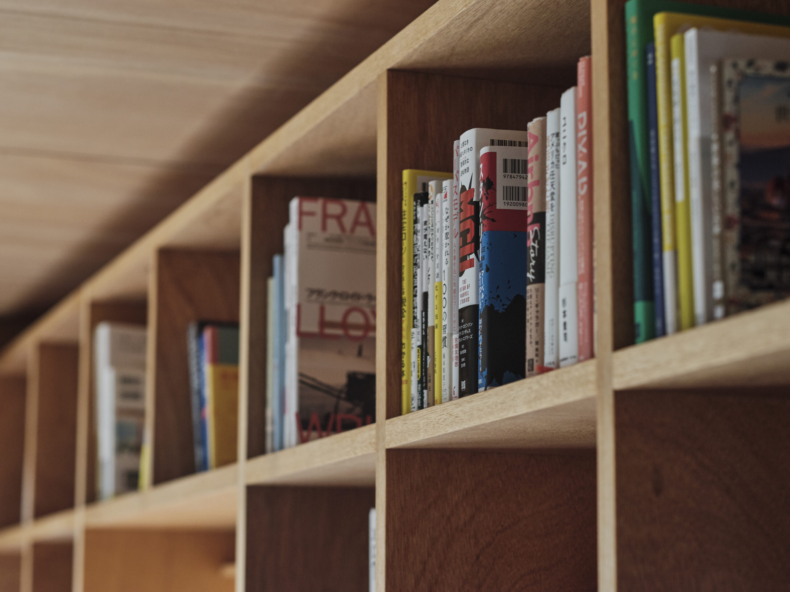 By placing lauan plywood furniture, walls, and ceilings in contrast with cation-filler plaster-finished walls and ceilings, the lounge presents different expressions when viewed from the monochromatic workspace and meeting room. This contrast not only differentiates the character of each space, but also alters the nature of their connection through the lounge.