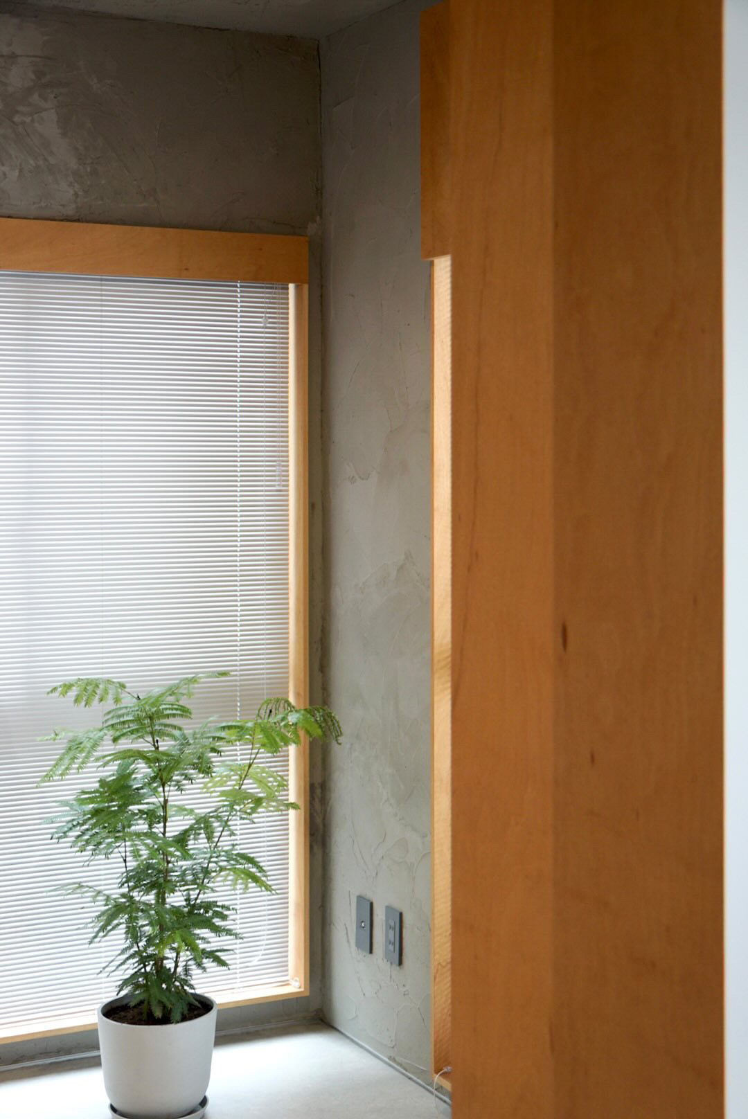 Facing southwest, four large windows bring views of the sky and gentle daylight in the morning, while requiring control of strong western sun in the evening as well as privacy toward neighboring units. To address this, frame-like blind boxes are introduced as devices that soften the presence of the existing window sashes while regulating light, air, and sightlines that cross between interior and exterior.